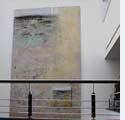 ![]() In seiner Inhaltlichkeit ist diese Arbeit meinem Arbeitsthema himmelhoch/erdentief zuzuordnen. Dabei hält die Suche nach der imaginären Grenze zwischen den Bereichen sinnlicher und intellektueller Wahrnehmung die Entwicklung der Arbeit ständig in Bewegung. Was daraus entsteht, ist ein Gemälde, das es auf eigenartige Weise schafft, Polaritäten zu vereinen und das Gefühl zu vermitteln, der Kosmos sei Ur(mal)grund des Bildes. Was ist beim ersten Ansichtigwerden des Bildes wahrnehmbar? Von oben beginnend scheint sich eine weite Landschaft mit hochliegendem Horizont in den Bildraum auszubreiten. Wandert der Blick schrittweise nach unten, ändert sich diese Illusion grundlegend, scheint eine grobe flächige Struktur die Oberhand zu gewinnen. Räumlichkeit fehlt, doch ist die Assoziation zu Satellitenaufnahmen nicht von der Hand zu weisen. Noch weiter nach unten gehend, erscheint neuerlich eine Landschaftsabbildung, die durch ihre klare Abgrenzung mit Schattenwurf deutlich als Bild zu identifizieren ist, welches der angesprochenen Flächenstruktur parallel vorgelagert ist. Die Horizontanordnung vom oberen Bildrand wiederholt sich, doch ist diesmal die räumliche Suggestivkraft um einiges gesteigert. Auch hier verliert sich der Vordergrund, wird aber durch den klaren Bildrand zusammengehalten. Der Bildaufbau kommt einem Pulsieren nahe. Gegenständlichkeit kommt und geht, klare Zeichnung wechselt mit Auflösung, die große Struktur wird von Kleinteiligkeit abgelöst, man vermeint, in die Tiefe eindringen zu können, hat aber unvermittelt eine Wand vor sich. Und doch sind diese wechselhaften Eindrücke als ineinander verwoben und voneinander bedingt zu erfassen. Die Grenzlinie ist nicht mehr auszumachen, das Ausscheren nach beiden Richtungen bringt weitere Assoziationen ins Spiel. Der Horizont wird zur Metapher unseres vergeistigten Gesichtskreises, zur Einladung, all das Dahinterliegende in uns entstehen zu lassen. Die Basisstruktur erweist sich als Chamäleon. Will hier der Mikro- oder der Makrokosmos angesprochen werden. Ist es ein Innen oder Aussen. Handelt es sich um eine tragende Schicht oder lässt sie uns ohne Vorwarnung durchfallen. Die Annahme, es handle sich dabei um die Vielschichtigkeit irdischen Lebens, wird erst dann schlüssig, wenn das bewusste Erkennen der äußeren Perspektive mit intuitivem Erfassen innerer Reaktion in Einklang kommt. -------- im grenzbereich der wahrnehmung 1994 Öl auf Molino, Format 460x300 cm Auftragsarbeit für die Bernhauser Bank, Filderstadt/D |